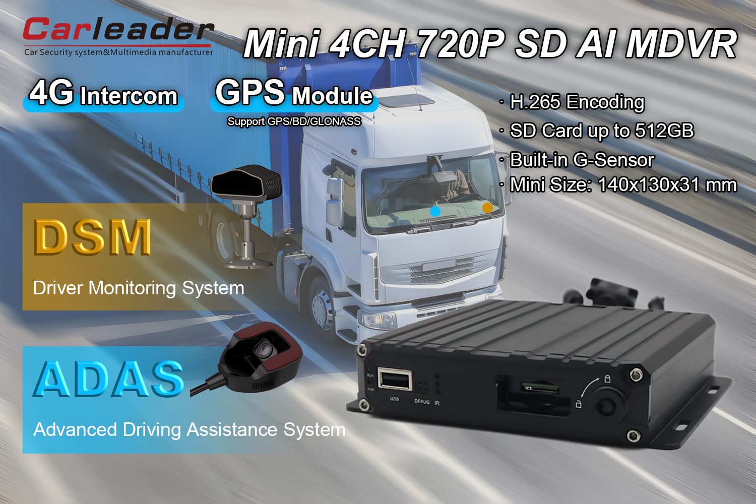عوامی نقل و حمل ، رسد اور بیڑے کے انتظام ، قانون نافذ کرنے والی گاڑیاں ، تجارتی نقل و حمل اور کسی بھی منظر نامے کے لئے کارلیڈر 4CH AI ذہین موبائل DVR جس میں DSM اور ADAS کیمرا مثالی ہے۔