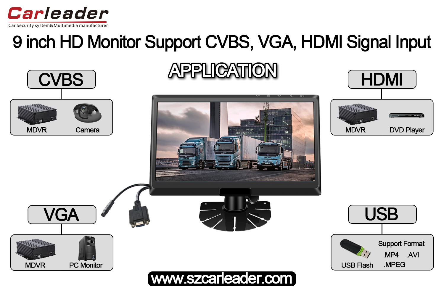 کارلیڈر9 انچ آئی پی ایس اسکرین ایچ ڈی مانیٹر سپورٹ سی وی بی ایس+ایچ ڈی+وی جی اے ان پٹایک اعلی کارکردگی کا ایچ ڈی مانیٹر ہے جو گاڑیوں کی نگرانی اور MDVR فلیٹ مینجمنٹ کے لئے ڈیزائن کیا گیا ہے۔ کار مانیٹر سی وی بی ایس ، ایچ ڈی اور وی جی اے سگنل آدانوں کی حمایت کرتا ہے۔ اور اگر ایم ڈی وی آر میں وی جی اے یا ایچ ڈی انٹرفیس ہے تو ، 9 انچ آئی پی ایس اسکرین کار مانیٹر کے ساتھ استعمال ہوسکتا ہے۔