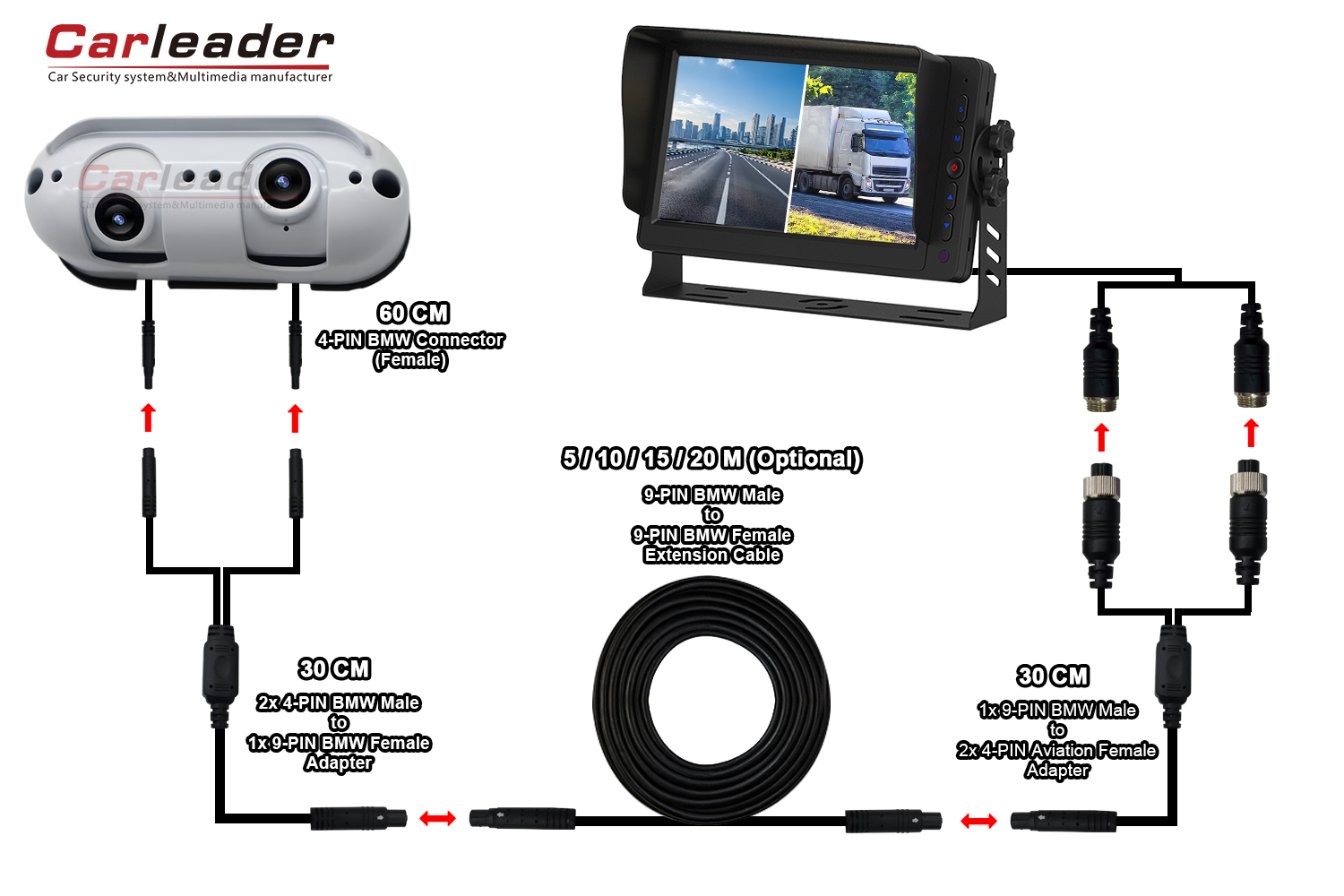 پہلا حل صرف ایک توسیع کیبل (9 پن BMW کنیکٹر) کا استعمال کرتا ہے ، کیمرہ اور مانیٹر کو مربوط کرنے کے لئے دونوں اختتام کے لئے 1 سے 2 اسپلٹ کیبل استعمال کرتا ہے۔ کیونکہ یہ حل صرف ہم ایکسٹینشن کیبل پر ہے ، جو وائرنگ کے عمل کو آسان اور آسان بنا دیتا ہے۔