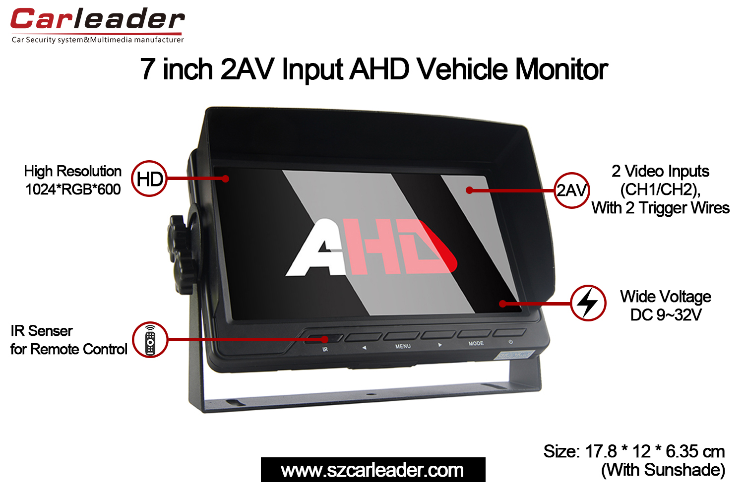 کارلیڈر 7 انچ AHD 2CH ان پٹ وہیکل مانیٹرایک کمپیکٹ اور پائیدار ڈیزائن میں وشوسنییتا، وضاحت، اور استعداد کو یکجا کرتا ہے، جو اسے پیشہ ورانہ اور ذاتی گاڑیوں کی نگرانی کی ضروریات کے لیے ایک بہترین انتخاب بناتا ہے۔