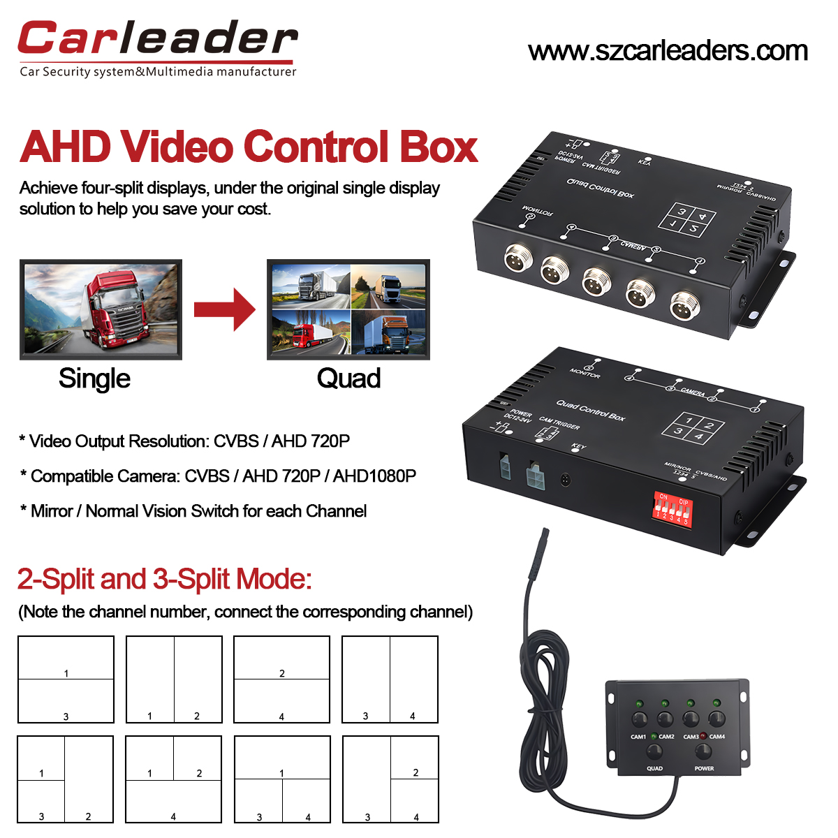 اس AHD کواڈ ویڈیو اسپلٹ باکس کا بنیادی حصہ ایک پاور سپلائی اور ایک ویڈیو ملٹی پلیکسر ہے، جو گاڑیوں کے لیے ایک ڈیوائس میں ملا ہوا ہے۔ جیسے بسیں، ٹرک، ٹریلرز اور دیگر ہیوی ڈیوٹی گاڑیاں۔ 4-چینل چار آزاد AHD کیمروں کی مدد کے لیے ڈیزائن کیا گیا ہے۔ اور ایک مانیٹر کے ساتھ کام کریں۔ کواڈ ویو اے ایچ ڈی 4 چینل کنٹرول باکس کا بنیادی کام ہے۔ گاڑی AHD سپلٹ کنٹرول باکس چاروں منسلک کار کیمروں سے ویڈیو سگنل وصول کرتا ہے اور ایک ہی سکرین مانیٹر پر چاروں تصاویر کو بیک وقت دکھاتا ہے۔ کنٹرول باکس سے مراد باکس کے دیگر افعال ہیں، اے ایچ ڈی اسپلٹ کنٹرول باکس کیمروں کو طاقت فراہم کرتا ہے اور یا تو ایک ڈسپلے یا اسپلٹ اسکرین ڈسپلے کو کنٹرول کرتا ہے۔ اے ایچ ڈی (اینالاگ ہائی ڈیفینیشن) ڈسپلے اور کنٹرول باکس کے ساتھ مطابقت رکھنے والے ویڈیو فارمیٹس کی وضاحت کرتا ہے۔ AHD ویڈیو کنٹرول باکس AHD کیمروں (جیسے، AHD 720p، 1080p) یا CVBS کیمروں کے لیے موزوں ہے۔ صرف چار AHD کیمرے یا چار CVBS کیمرے بیک وقت معاون ہیں۔